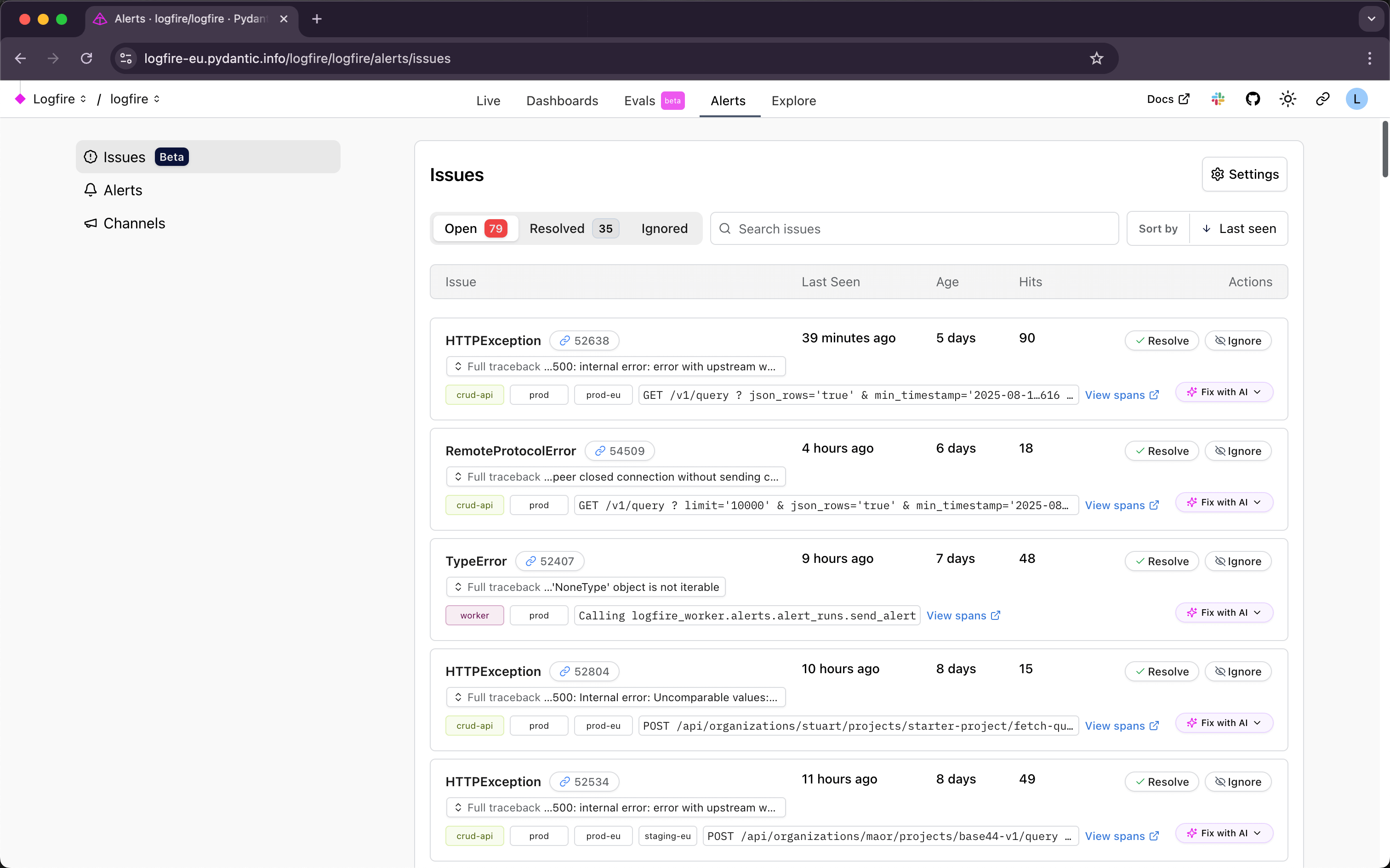 Logfire issues screen