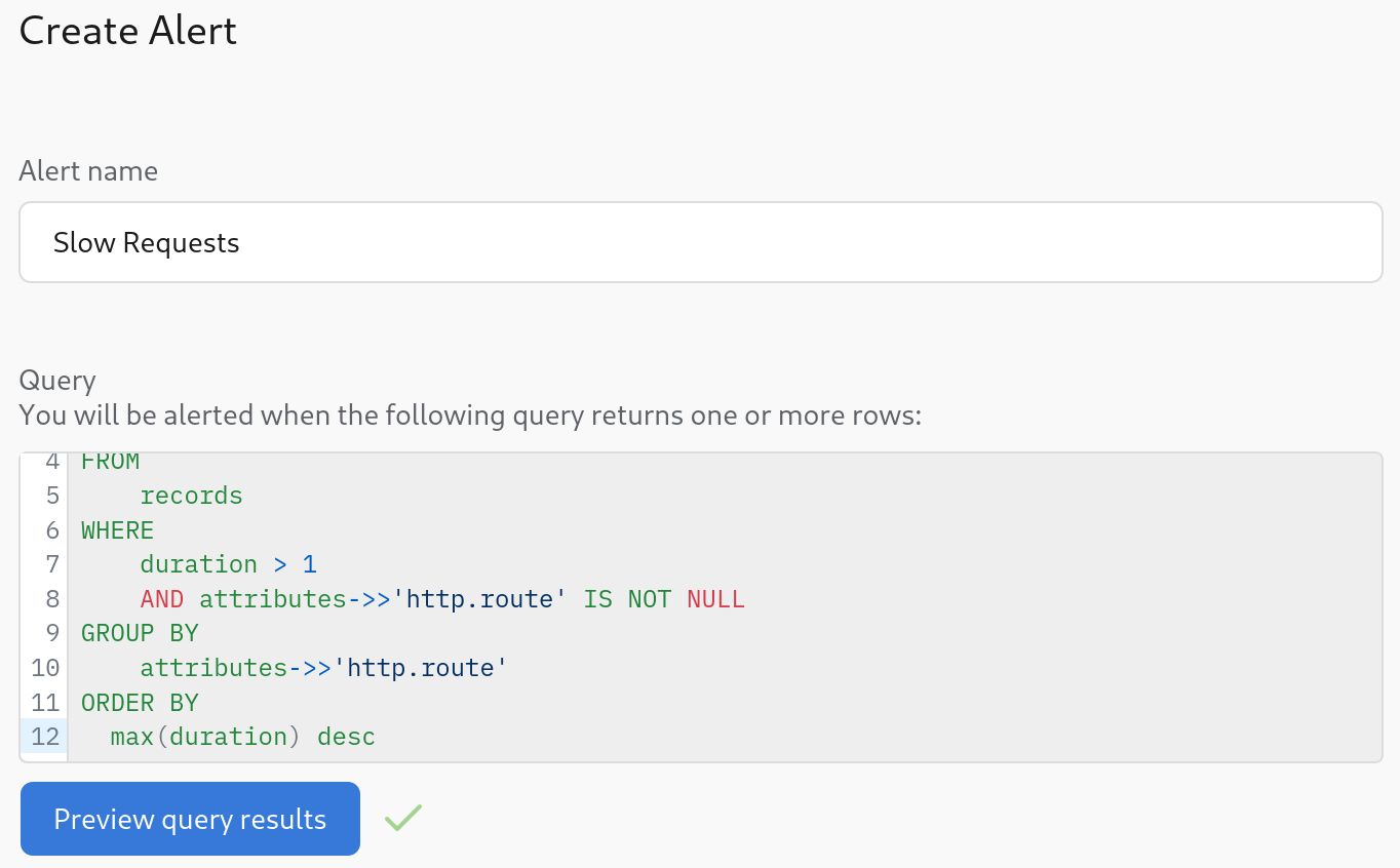 • Click Preview query results and make sure you get some results back. If your service is lightning fast, firstly congratulations! Secondly try adjust the duration cutoff to something smaller, like duration > 0.1 (i.e, any requests taking longer than 100ms).